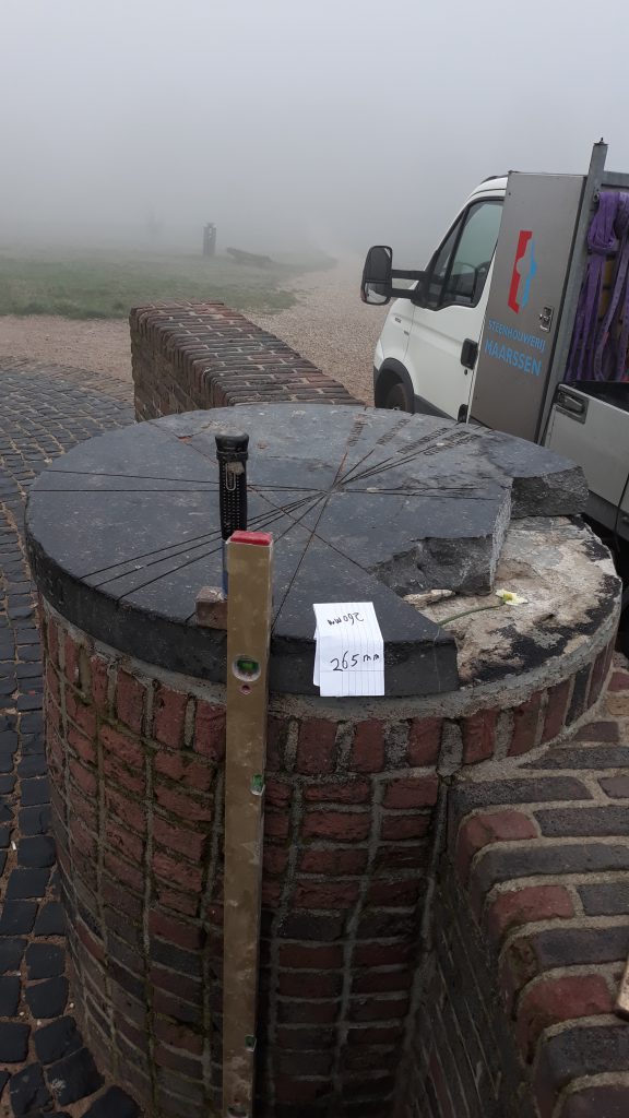 Het vernieuwen van de steen en nieuwe tekst toevoegen, deze was door vernieling niet meer te restaureren.