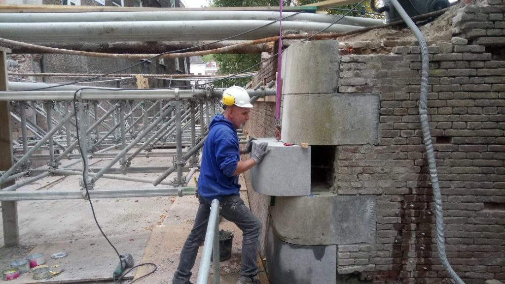 Nieuwe blokken van Belgisch hardsteen plaatsen, met een frijnslag van 38 in een palm.