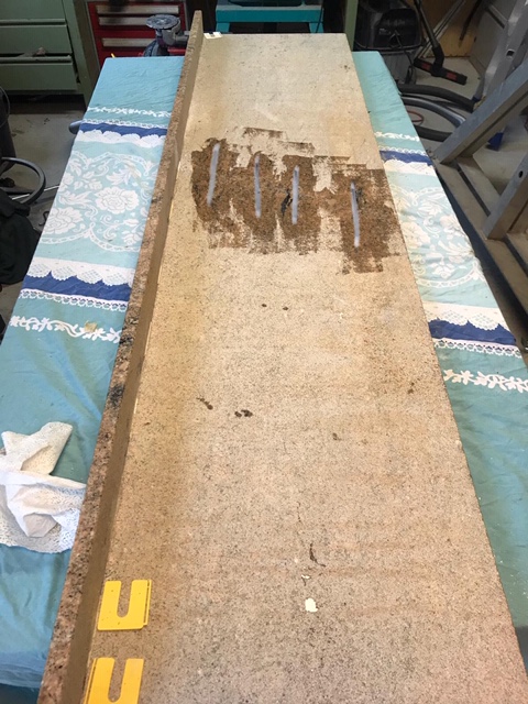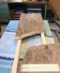 Halmstadt kastblad restaureren, die gebroken was, d.m.v. verlijming en voorzien van een wapeningsnet, de lijm op kleur maken van het patroon op het kastblad.