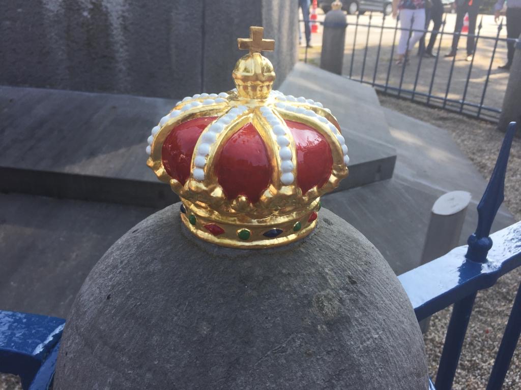Daarna hebben we het voegwerk hersteld en de bronzen plaquette opgepoetst, en kroontjes teruggeplaatst die 30 jaar weggeweest zijn.