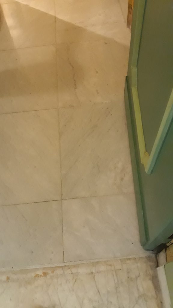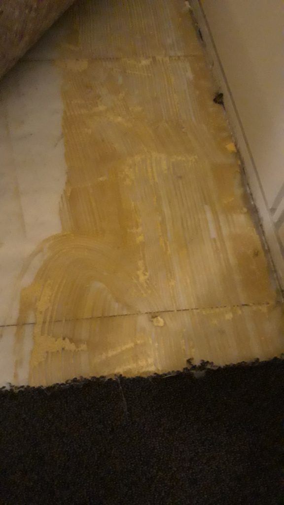 Het verwijderen van tapijtlijm van een marmeren vloer.