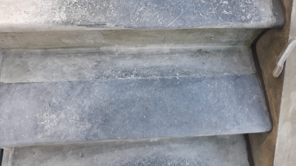 De bovenkant van de trede was zodanig weggesleten, dit hebben we opgelost d.m.v. een groot inboetstuk te zetten op de bovenkant.